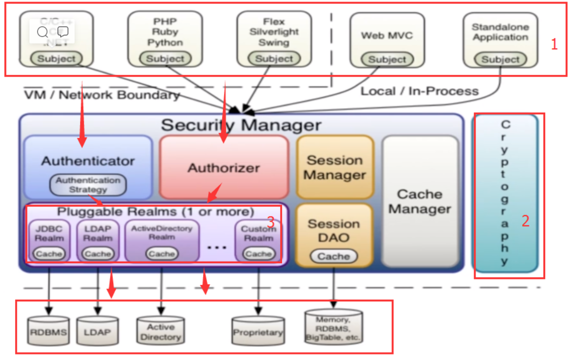 - 上面标记为1的是shiro的主体部分subject,可以理解为当前的操作用户