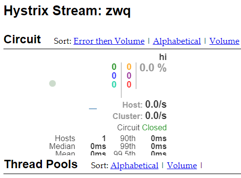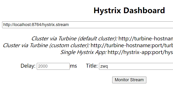 访问:http://localhost:8764/hystrix ,然后在界面上填写http://localhost:8764/hystrix.stream 、2000、zwq(这个随意填)