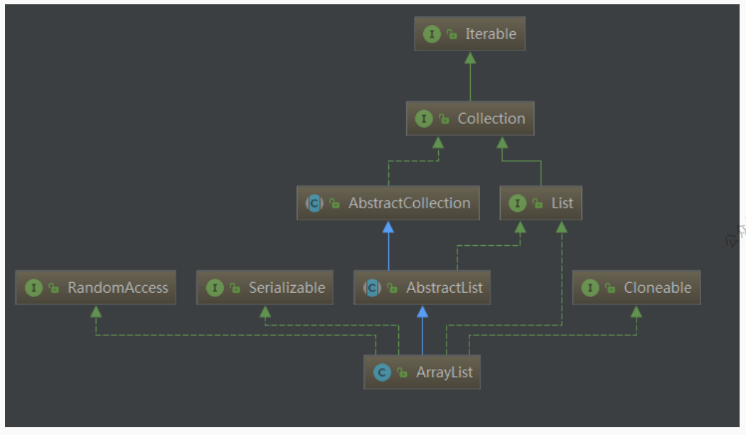 - ArrayList实现了AbstractList抽象类、List接⼝、所以其更具有了AbstractList和List的功能、前⾯我们知道AbstractList内部已经实现了获取Iterator和ListIterator的⽅法、所以ArrayList只需关⼼对数组操作的⽅法的实现