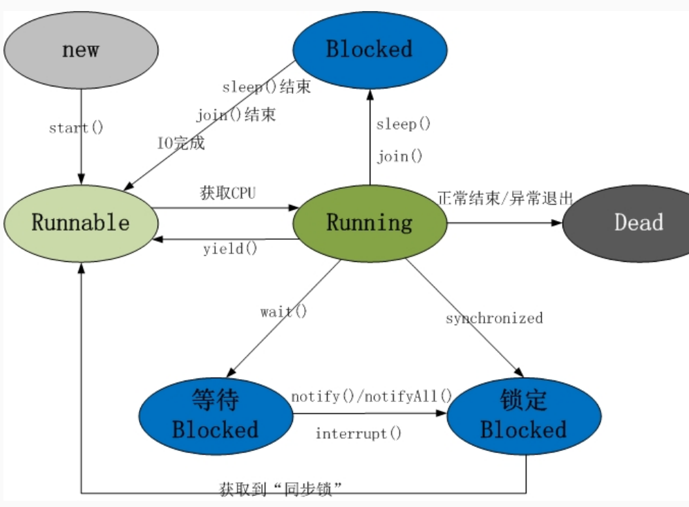 - 同步阻塞: 线程在获取synchronized同步锁失败(因为锁被其它线程所占⽤),它会进⼊同步阻塞状态;
