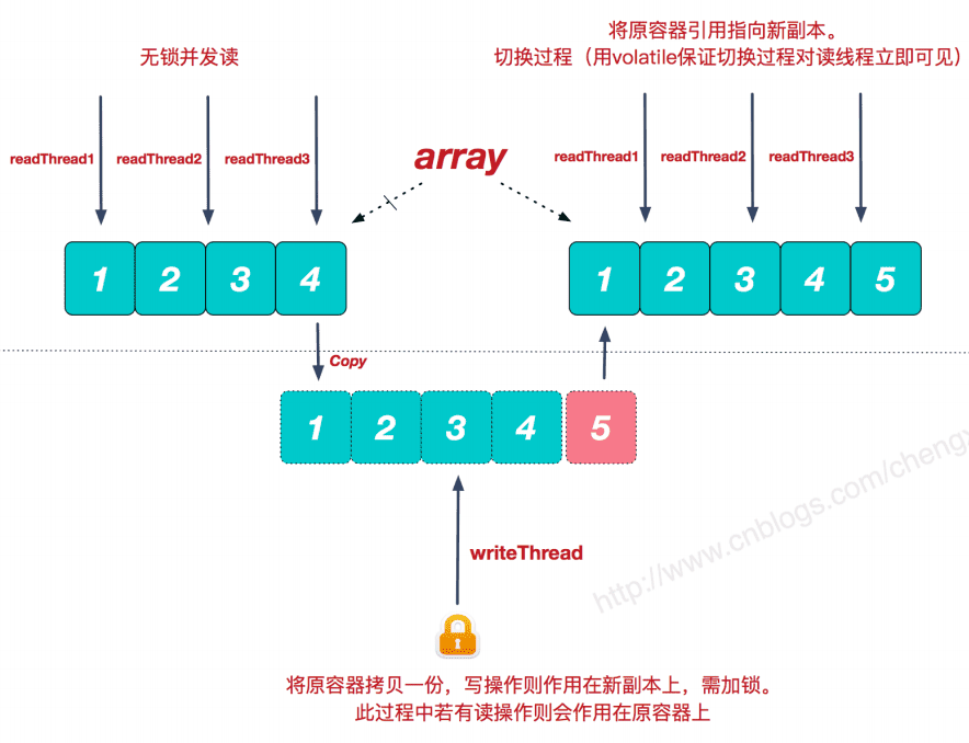CopyOnWriteArrayList容器允许并发读,读操作 是⽆锁的,性能较⾼。⾄于写操作,⽐如向容器中添加⼀个元素,则⾸先将当前容器复制⼀份,然后在新 副本上执⾏写操作,结束之后再将原容器的引⽤指向新容器。