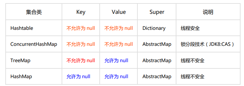 - 高度注意Map类集合K/V能不能存储null值的情况,如下表格