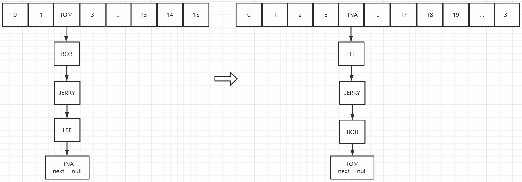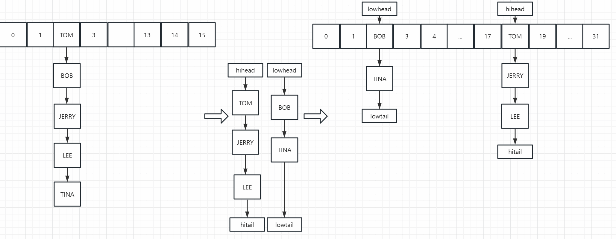 然后把低位链表移动到新数组,相同的index的位置,高位链表移动到新数组(index + 容量)的位置(扩容之后的另一半空间),不需要rehash(需要满足容量为2的指数次幂)