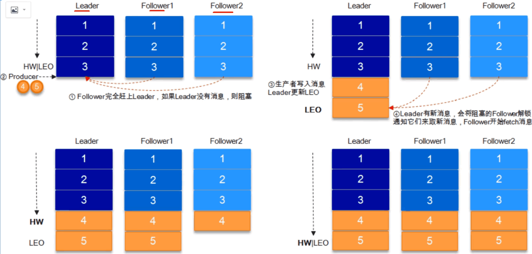 HW高水位,LEO(log-end-offset最大offset),HW就是取ISR中最小的LEO,consumer消费时最多只能消费到HW(leader新写入消息时,consumer不能马上消费,需要等到ISR中的副本同步完全,全部同步后HW更新,这时候consumer就能消费新消息了)