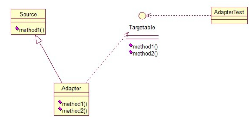 持有Source类的实例,解决兼容测试:public class Wrapper implements Targetable { private Source source; public Wrapper(Source source){ super(); this.source = source; } @Override public void method2() { System.out.println("this is the targetable method!"); } @Override public void method1() { source.method1(); } }public class AdapterTest { public static void main(String[] args) { Source source = new Source(); Targetable target = new Wrapper(source); target.method1(); target.method2(); } }- 接口的适配器模式